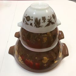 Pyrex Glass vintage early American Cinderella nesting mixing bowls Set lot 22 karat gold Accents white and brown$40Streetsboro, OH