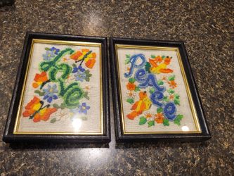 Needlepoint PEACE and LOVE floral, set of 2 approx 5x7" framed$5Janesville, WI