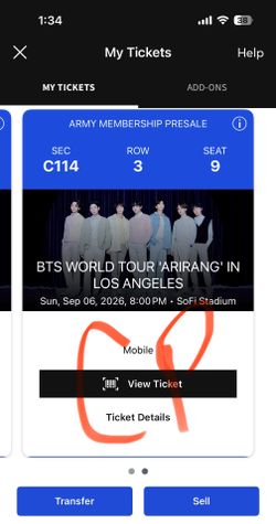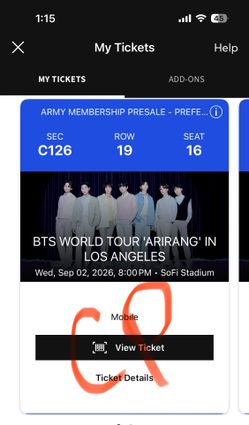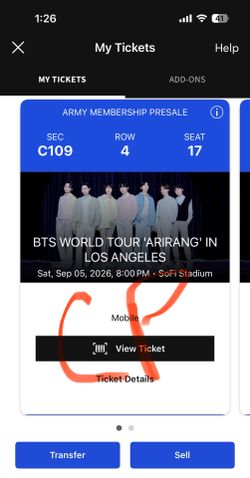 2 BTS tickets Sofi 9/6 Section C114$2,000Irvine, CA
