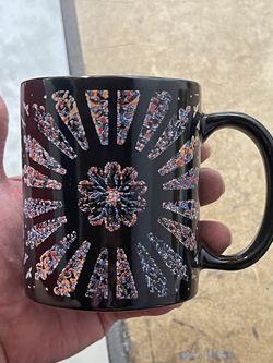 black ceramic mug features a hand-painted, textured dot mandala design.$12Quartz Hill, CA