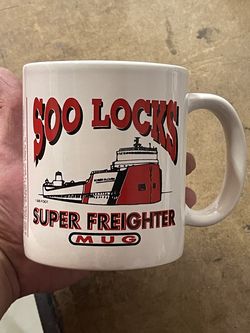 collectible ceramic mug featuring a graphic of the "Roger Blough" 1,000-foot freighter at the Soo Locks. It is a souvenir mug commemorating the Soo L$12Quartz Hill, CA