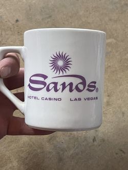 vintage coffee mug from the Sands Hotel and Casino in Las Vegas. Type: Collectible souvenir coffee mug. Design: White ceramic with a purple "Sa$10Quartz Hill, CA