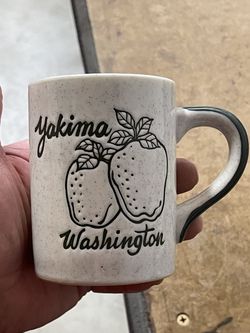 vintage-style ceramic coffee mug features a rustic speckled design and decorative illustrations of strawberries with the text "Yakima Washington". De$6Quartz Hill, CA