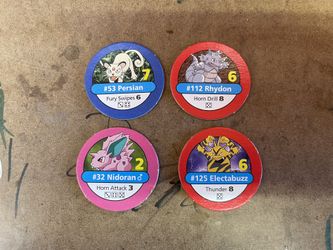vintage Pokémon Master Trainer board game POGs or tokens from the 1999 Milton Bradley game. They feature various Pokémon, including Persian (#53), N$10Quartz Hill, CA