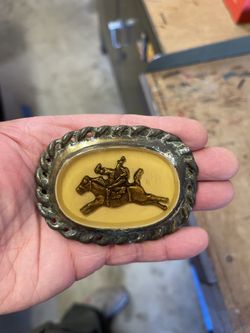 vintage brass rodeo cowboy belt buckle, from the 1970s, featuring a saddle bronc horse and rider design. The buckle has an oval shape with a decorati$25Quartz Hill, CA