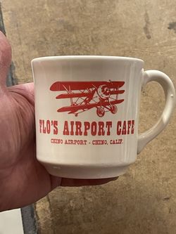 collectible ceramic coffee mug featuring a biplane graphic and the logo for "Flo's Airport Cafe" located at the Chino Airport in Chino, California. D$10Quartz Hill, CA
