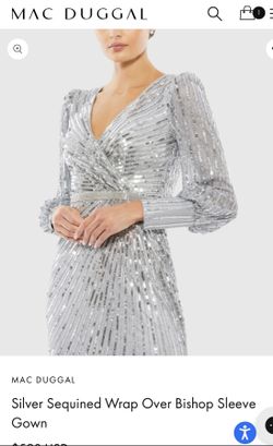 Mac Duggal Silver Sequined Wrap Over Bishop Sleeve Gown$200Long Beach, CA