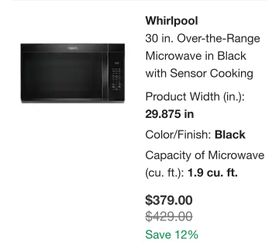 Whirlpool 30 Inch Black Over The Range Microwave With Sensor Cooking (Brand New In Box)$225Yorkville, IL