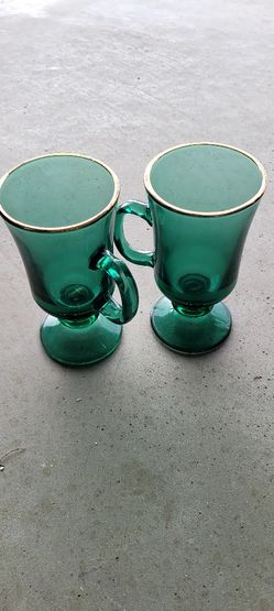Vintage Set 2 Libbey Glass Pedestal Cups Mugs Handle Green Gold Trim Espresso