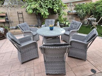 7-Piece Patio Dining Set – Wicker with Cushions & Glass Top Table
