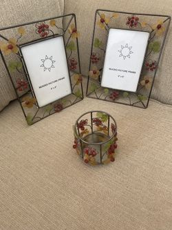 This is a metal picture frame with a floral, beaded design and a candle holder $15Gilbert, AZ