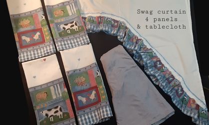 6-piece Curtains & Tablecloth Set, 1 Swag, 4 panels, + tablecloth, excellent cond. - Swag: 58"W x 35"L - Panels: 58"W x 36"L, Tablecloth 65" round$14Clinton, MD