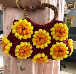 yellow FALL CROCHET HANDMADE 3D-FLOWER wood handles PURSE PARTY Evening Bag USA$78Apple Valley, MN