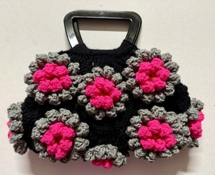 CROCHET HANDMADE 3D-FLOWERS BLACK PINK wood handles PURSE PARTY Evening Bag USA $78Apple Valley, MN