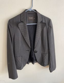 This is a grey striped women's suit set. • The fabric is a blend or wool-like formal fabric in a medium grey color. • Pattern: The main body features $40San Francisco, CA