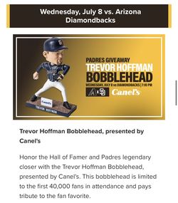 Padres vs Diamondbacks- July 8- Trevor Hoffman Bobblehead Giveaway$75Lemon Grove, CA