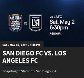San Diego FC vs LAFC- Saturday, May 2 @ 6:30pm$110Lemon Grove, CA