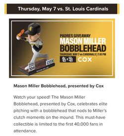 Padres vs Cardinals, Thursday, May 7- Mason Miller Bobblehead Giveaway$75San Diego, CA