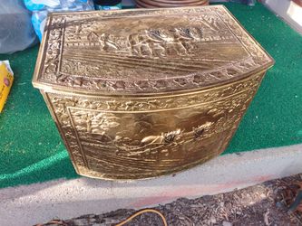 Hand Hammered Cottage Anne Brass Fireside Storage Trunk with Lid, 1900s
