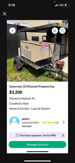 Generator 23 Kilowatts Propane Gas $3,000Hialeah, FL