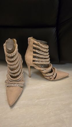 Chic Nude Suede Caged High Heels with Braided Chain Detail$20Princeton, FL