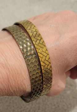 A pair of vintage or antique gold-toned metal bangles with a honeycomb pattern and a brick-patterned design. $30Los Angeles, CA