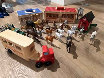 wooden horse farm / stable playset with multiple horses, trailers, barns, fences, and vehicles$38Irvine, CA