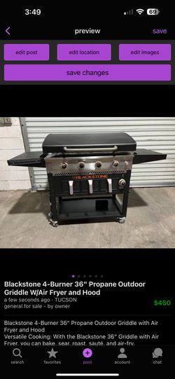 Blackstone 4-Burner 36" Propane Outdoor Griddle W/Air Fryer and Hood$450Tucson, AZ