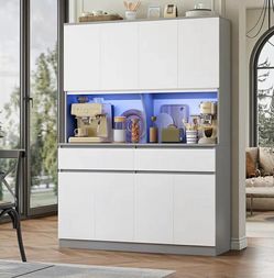 75"H x 55"W Kitchen Pantry Cabinet with LED Lights and Doors, Large Kitchen Hutch Storage Cabinet with Drawers, Food Pantry with Microwave Stand and C$219Downey, CA