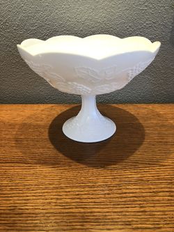 Vintage Antique Gorgeous Milk Glass Serving Pedestal Bowl. Scalloped Rim And Grapes Decorated . No markings or brand. Size 10 inches wide across th$75Artesia, CA