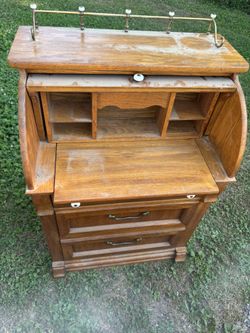 This is a Pulaski Keepsakes Collection petite roll-top desk in oak with a brass gallery and porcelain finials$150Dayton, OH