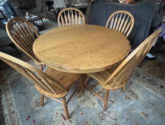 Solid Oak Pedestal Dining Table w/24" Leaf and 5 Arrowback Chairs by America Furniture$250Minneapolis, MN