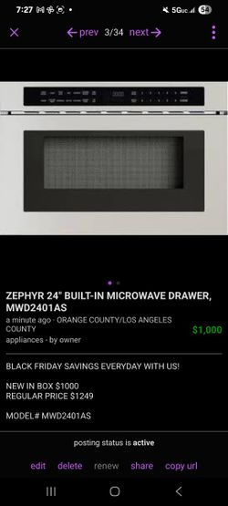 Zephyr 24" Built-In Microwave Drawer $1,000Long Beach, CA
