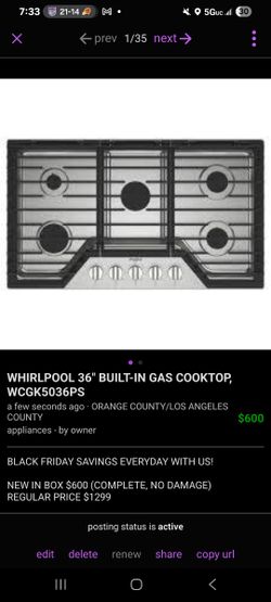 Whirlpool 36" Built-In Gas Cooktop$600Long Beach, CA