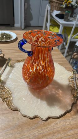 Nouveau Orange Spatter Art Glass Vase with Cobalt Blue Applied Twin Handles 7”$20Sanford, FL