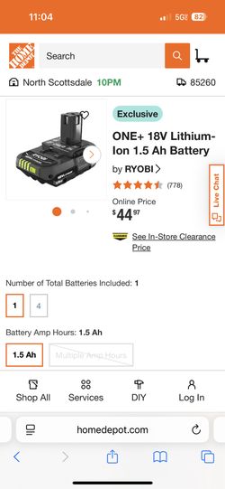 ONE+ 18V Lithium-Ion 1.5 Ah Battery RYOBI$35Scottsdale, AZ