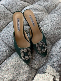 MANOLO BLAHNIK HANGISIMU Green Satin Jewel Buckle Mules Size 38$200Spring Valley, CA