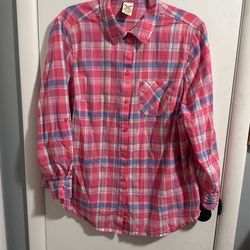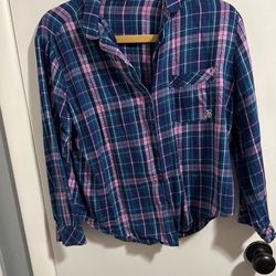 Secret button up long sleeve, shirt, size medium plaid colors, navy blue, purple, and pink plaid pocket emblem. VS.$6Wichita, KS