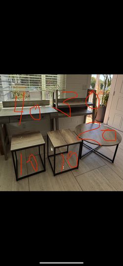 2 side tables, round table, desk and other shelf$35San Diego, CA