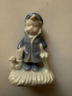 Vintage ceramic figurine depicting a young boy dressed in a raincoat and hat, holding an umbrella next to a small duck$11Vernon Hills, IL