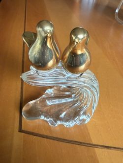 Vintage art glass sculpture featuring two gold-colored birds perched on a clear glass wave base$31Vernon Hills, IL