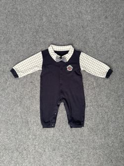 Classic Navy Baby Romper With Checkered Sleeves And Bow Tie$12Immokalee, FL