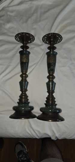 Pair Of Vintage of Asian Moroccan Brass & Green Marble Altar Candlestick Holders / Lamp Based$100San Bernardino, CA