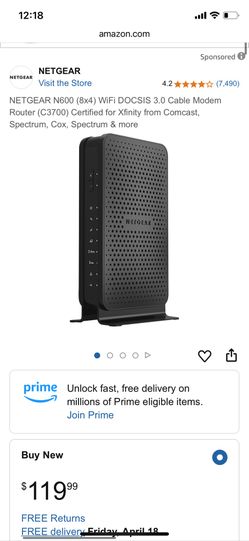 NETGEAR N600 (8x4) WiFi DOCSIS 3.0 Cable Modem Router (C3700) Certified for Xfinity from Comcast, Spectrum, Cox, Spectrum & more$50Richmond, CA