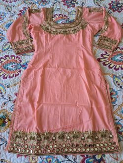 Peach 3 piece indian punjabi bollywood patiala salwar suit, with mirror embellishments, threadwork embroidery, large lightweight dupatta$200Union City, CA