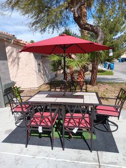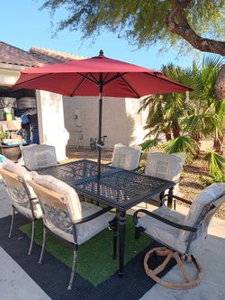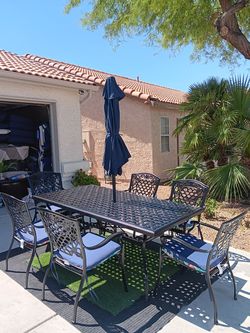 Patio Set Heavy Metal Table And 6 Chairs With New Cushions And New Umbrela$799North Las Vegas, NV