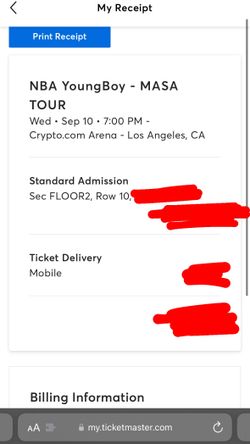 NBA Youngboy Concert Tickets Wednesday September 10 floor 2 Row 10 Front Row Up Close Exclusive Masa Tour Lil Wayne Chris Brown $850Los Angeles, CA