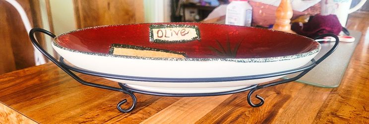 Parini Ceramic oval serving dish bowl metal stand A Taste of Tuscany Vino Olive