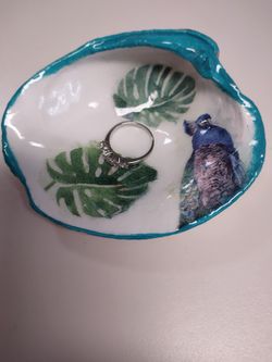 Peacock with palm leaves decoupaged and resin on clam shell$25Zephyrhills, FL