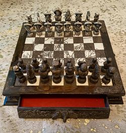 Hard to Find Vintage Mexican Revolution Themed Hand-Carved Chess Set w/ Stone Inlay Board & Drawer Storage$150Glendale, AZ